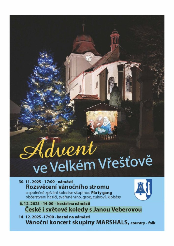 V příloze naleznete termíny akcí ve Velkém Vřešťově v předvánočním čase.